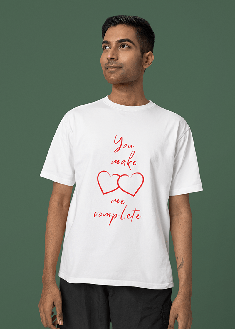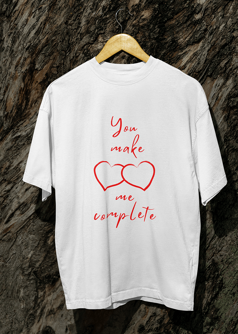 Wrap yourself in love with this oversized tee featuring two adorable heart outlines in red. The playful "You make me complete" text adds a sweet touch, making it perfect for Valentine's Day or any day you want to spread some love. Comfy, stylish, and effortlessly charming—this tee is all about celebrating connections in the coziest way possible!