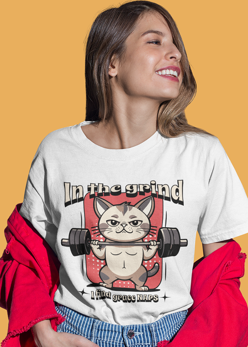 The Men’s In The Grind I Find Grace Naps T Shirt adds humor to hustle. Featuring bold typography at the top, a quirky graphic of a cat lifting weights in the middle, and the witty “I Find Grace Naps” text below, this white T shirt blends fitness fun with laid-back vibes. Soft and lightweight, it’s perfect for workouts, lounging, or just showing off your playful side.