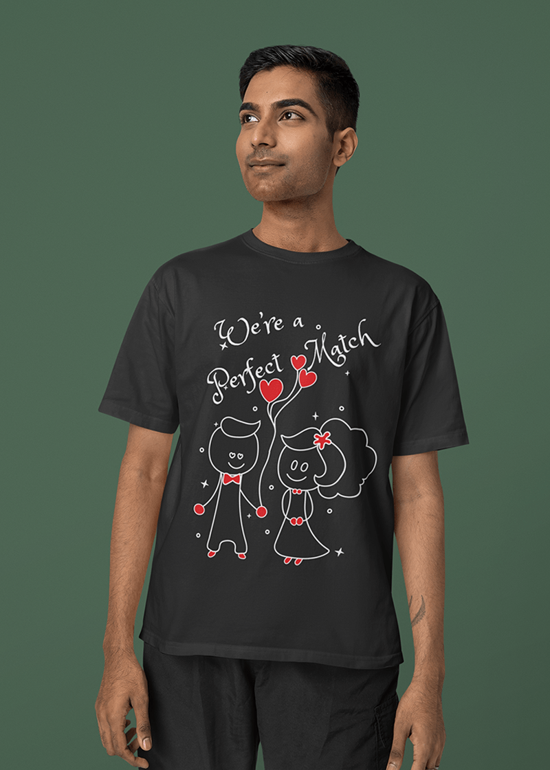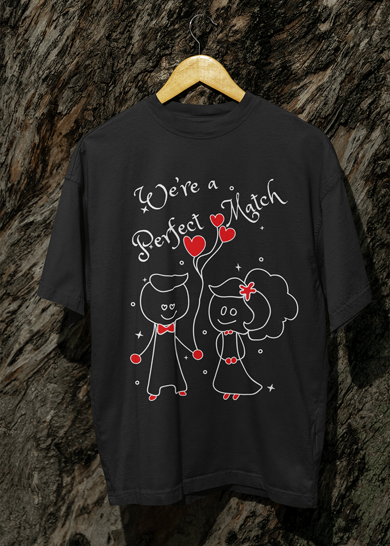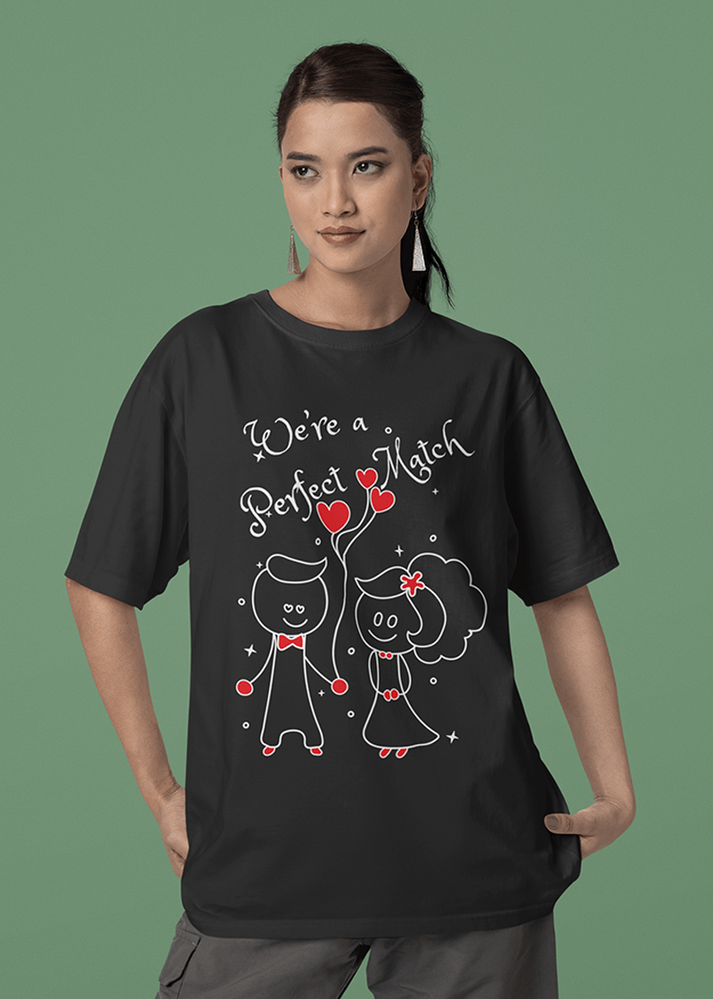 Celebrate your love in style with this oversized tee, featuring two adorable animated creatures sharing a sweet moment. The playful design and the text "We Are A Perfect Match" bring a fun, loving vibe to your Valentine's Day look. Crafted for comfort and perfect for pairing with jeans or leggings, this tee is your go-to for a cozy yet stylish celebration of love.
